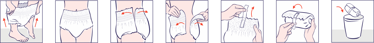 Następnie zroluj go, zabezpiecz tasiemką, która znajduje się w tylnej części majtek* po czym wyrzuć do kosza na odpady komunalne. Nie wyrzucaj produktu do toalety.