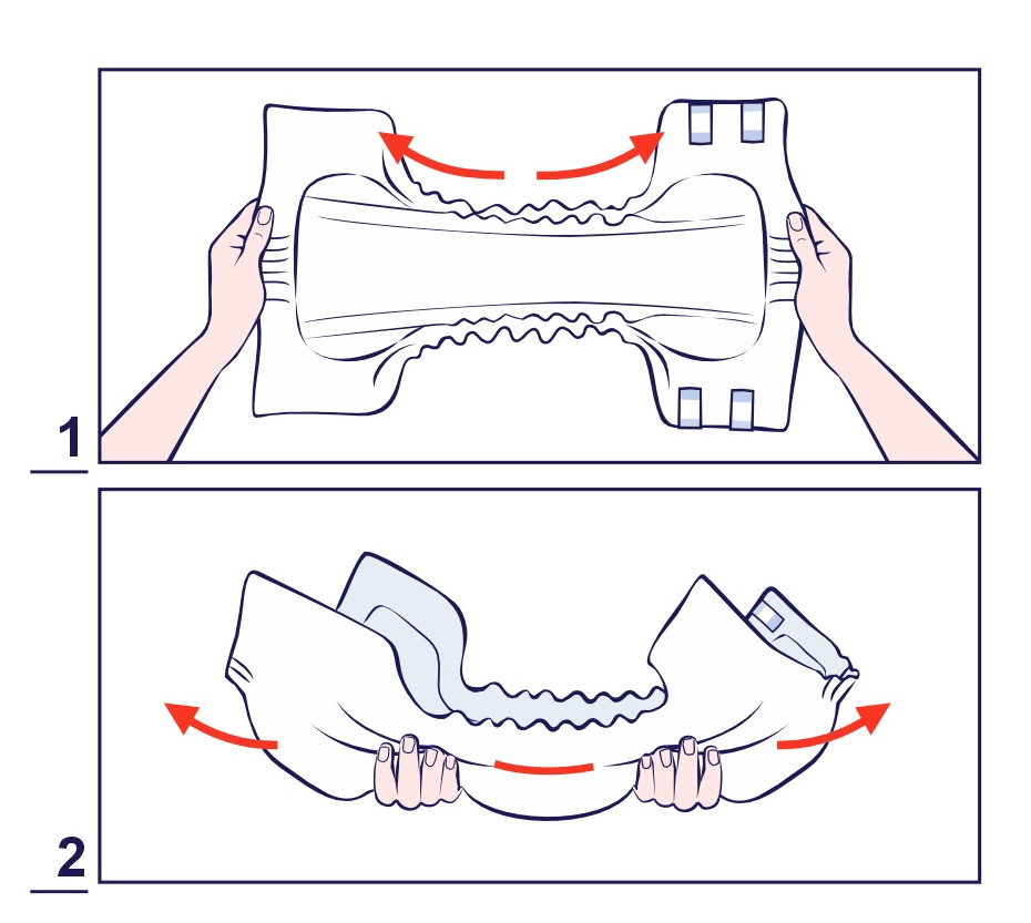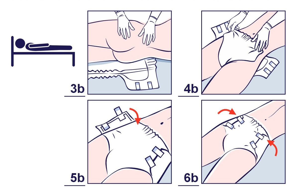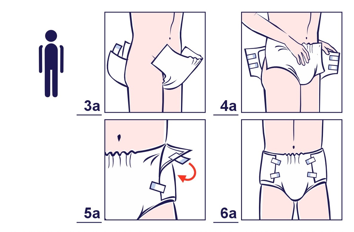 Połóż chorego na plecach, wyprostuj jego nogi i wyciągnij podwinięte skrzydło pieluchomajtek. Wyciągnij przednią część pieluchomajtek i dopasuj ją do krocza. Umocuj pieluchomajtki za pomocą elastycznych przylepcorzepów, zaczynając od dolnego zapięcia, które przyczep lekko skośnie do góry. Po umocowaniu dolnych zapięć umocuj górne przylepcorzepy, dopasowując pieluchomajtki do talii. Po zapięciu pieluchomajtek upewnij się, czy pielucha dobrze leży i przylega do ciała, czy osłonki nie są zwinięte i czy w żadnym miejscu pielucha nie wpija się w ciało. Zużyte pieluchomajtki zwiń i wyrzuć do kosza na śmieci. Nie wyrzucaj zużytego wyrobu do toalety.