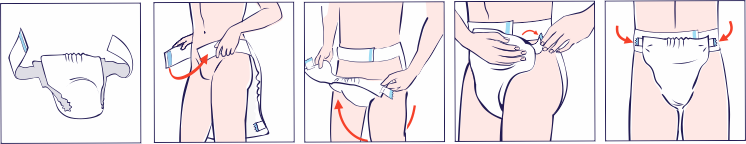 Aktywowane wcześniej pieluchy przyłóż do pośladków częścią chłonną tak, aby pasy biodrowe znajdowały się u góry. Owiń biodra pasami, zaczynając od lewej strony. Na pasie z prawej strony znajduje się rzep, którym możesz regulować obwód pieluchy w pasie.