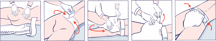 Obróć chorego na bok w kierunku do siebie i po dokonaniu czynności pielęgnacyjnych podłóż z tyłu pod chorego aktywowany wcześniej produkt. Powoli połóż chorego na pieluchę. Dopasuj pasy biodrowe do bioder chorego. Zacznij od lewego pasa, po czym dopasuj pas z prawej strony chorego i umocuj go za pomocą rzepa umieszczonego na końcu pasa.