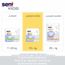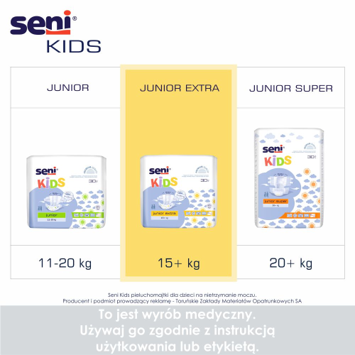 Seni Kids Junior Extra to pieluchomajtki dla dzieci z nietrzymaniem moczu i kału, dla których pieluszki dziecięce są już za małe, a nadal potrzebują chłonnego, komfortowego i skutecznego zabezpieczenia.