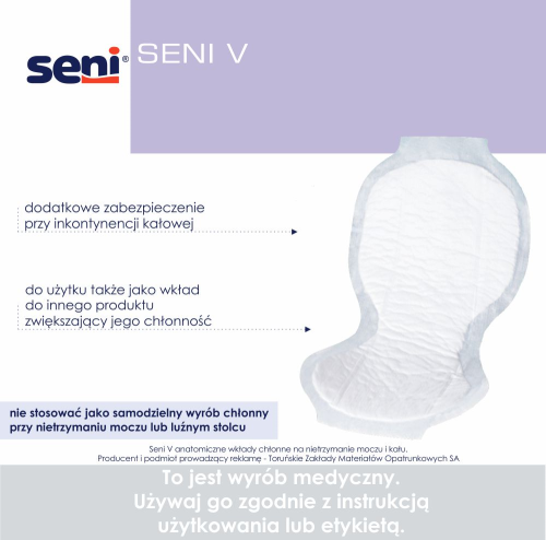 Seni V to anatomiczne wkłady chłonne specjalnego przeznaczenia. Przeznaczone dla osób z nietrzymaniem kału. Mogą być stosowane również jako wkład do innego produktu chłonnego, zwiększający jego chłonność. Nie stosować jako samodzielny wyrób chłonny przy luźnym stolcu lub przy nietrzymaniu moczu.